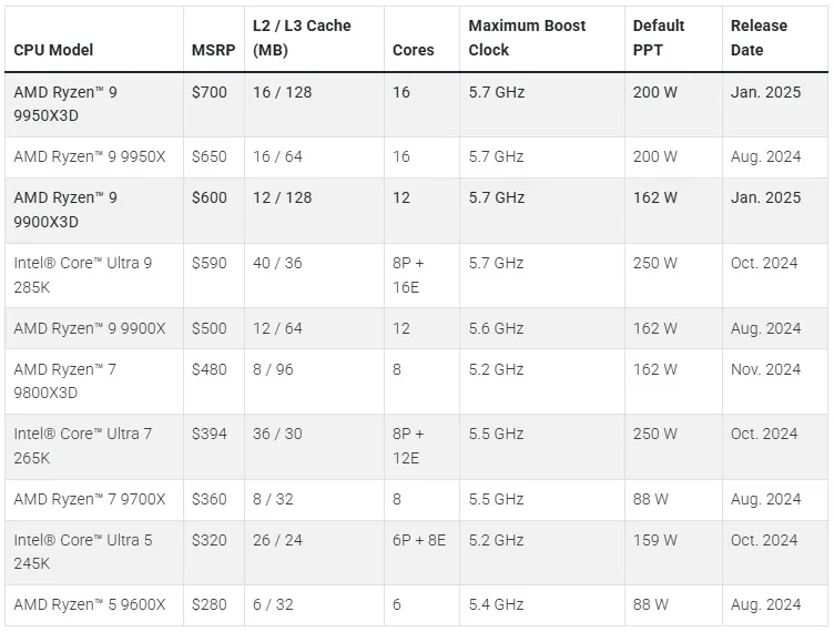 9950X3D/9900X3D có nhiều điểm tương đồng với phiên bản không X3D, ngoại trừ dung lượng bộ nhớ đệm L3 lớn hơn và giá cao hơn khoảng 50 USD. Chiến lược này khác biệt so với 9800X3D, vốn được tăng PPT để duy trì tần số hoạt động cao hơn.