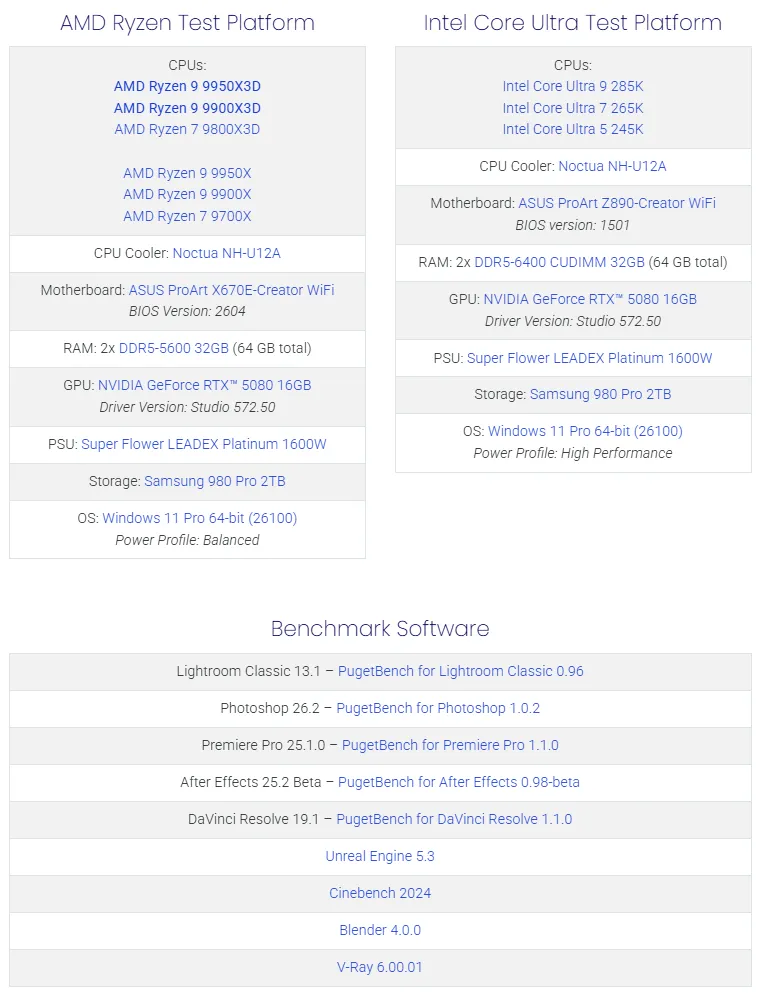 Bài đánh giá sử dụng cùng các phiên bản ứng dụng và trình điều khiển từ bài đánh giá GPU NVIDIA GeForce RTX 5070 gần đây. Các hệ thống Intel và AMD đều chạy trên BIOS và trình điều khiển chipset mới nhất, với VBS được bật. Các CPU Intel và AMD thế hệ hiện tại được so sánh trực tiếp, ngoại trừ 245K và 9600X do không có phiên bản X3D tương ứng. Các bộ xử lý AMD được thử nghiệm với các tính năng ép xung tắt và RAM chạy ở JEDEC 5600 Mbps, trong khi Intel sử dụng cài đặt BIOS Intel Performance Profile và RAM JEDEC 6400 CUDIMM. Các điểm chuẩn tiêu chuẩn ngành như PugetBench, Cinebench 2024, V-Ray và Blender được sử dụng để đánh giá hiệu năng trong các tác vụ sáng tạo nội dung.
