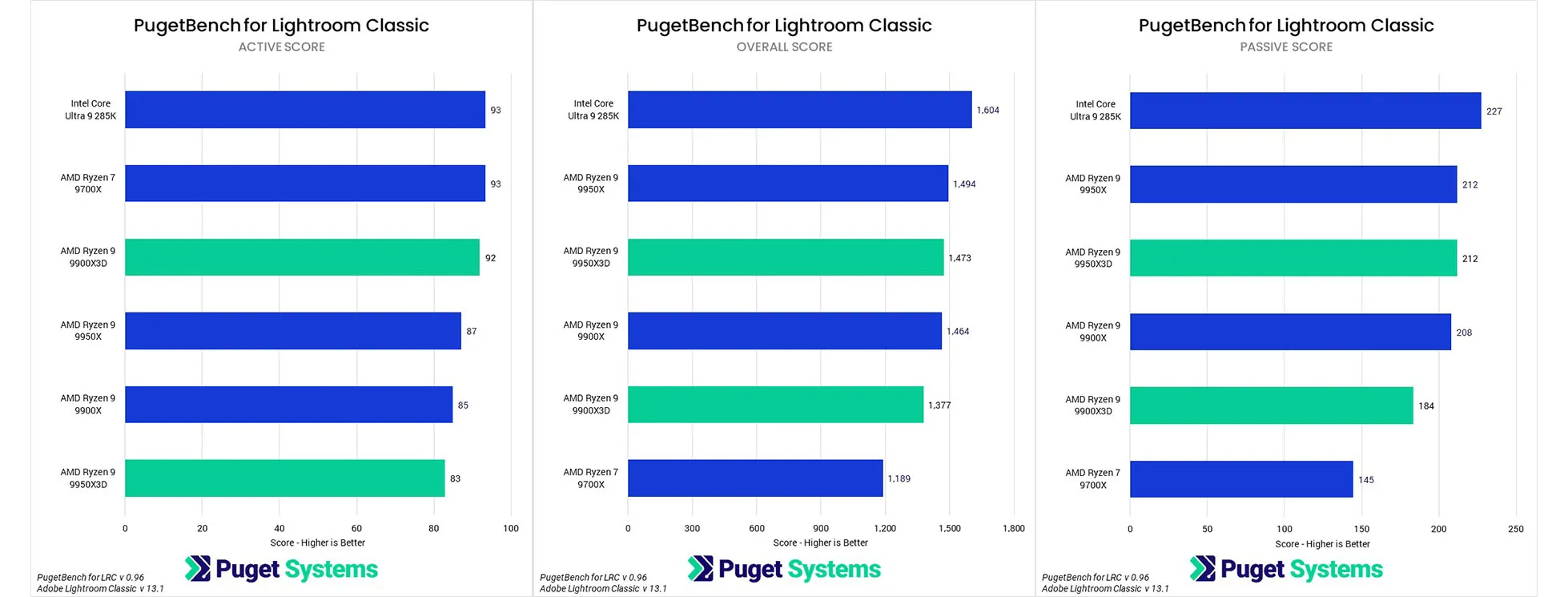 Các bài kiểm tra "Passive" cũng cho thấy kết quả tương tự, với 9950X3D ngang bằng 9950X, nhưng 9900X3D lại tụt hậu 11% so với 9900X. Dựa trên những kết quả này, chúng tôi không khuyến nghị sử dụng các CPU này cho Lightroom Classic, vì chúng chỉ mang lại hiệu suất tương đương với các phiên bản không phải 3D với mức giá cao hơn. Intel vẫn là lựa chọn tốt hơn về giá trị trong trường hợp này.