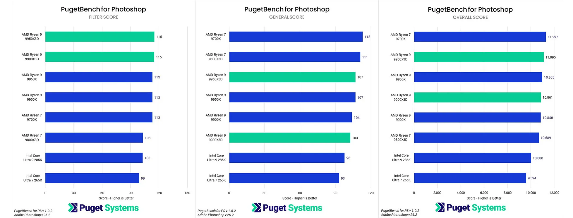 Phân tích điểm số phụ cho thấy trong các tác vụ "General", 9950X3D ngang bằng 9950X, cả hai đều chỉ kém Ryzen 7 một chút. 9900X3D cũng tương đương 9900X. AMD đều vượt trội hơn các CPU Intel đã thử nghiệm. Các bài kiểm tra "Filter" cũng cho thấy kết quả tương tự, với các CPU X3D CCD kép đứng đầu bảng xếp hạng.