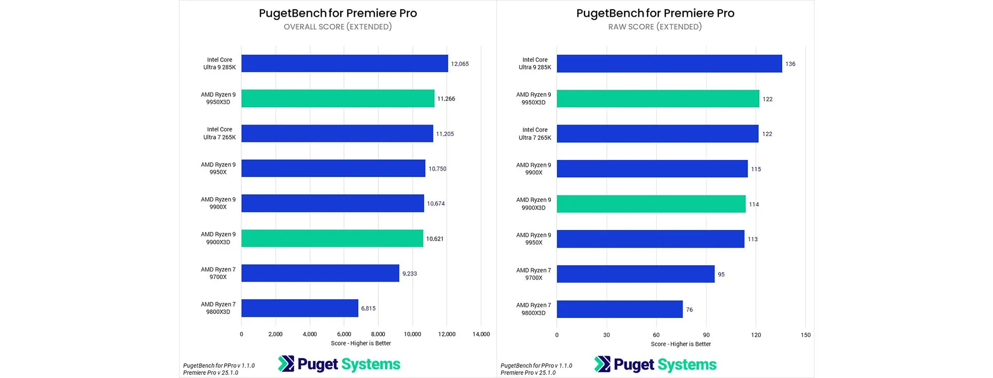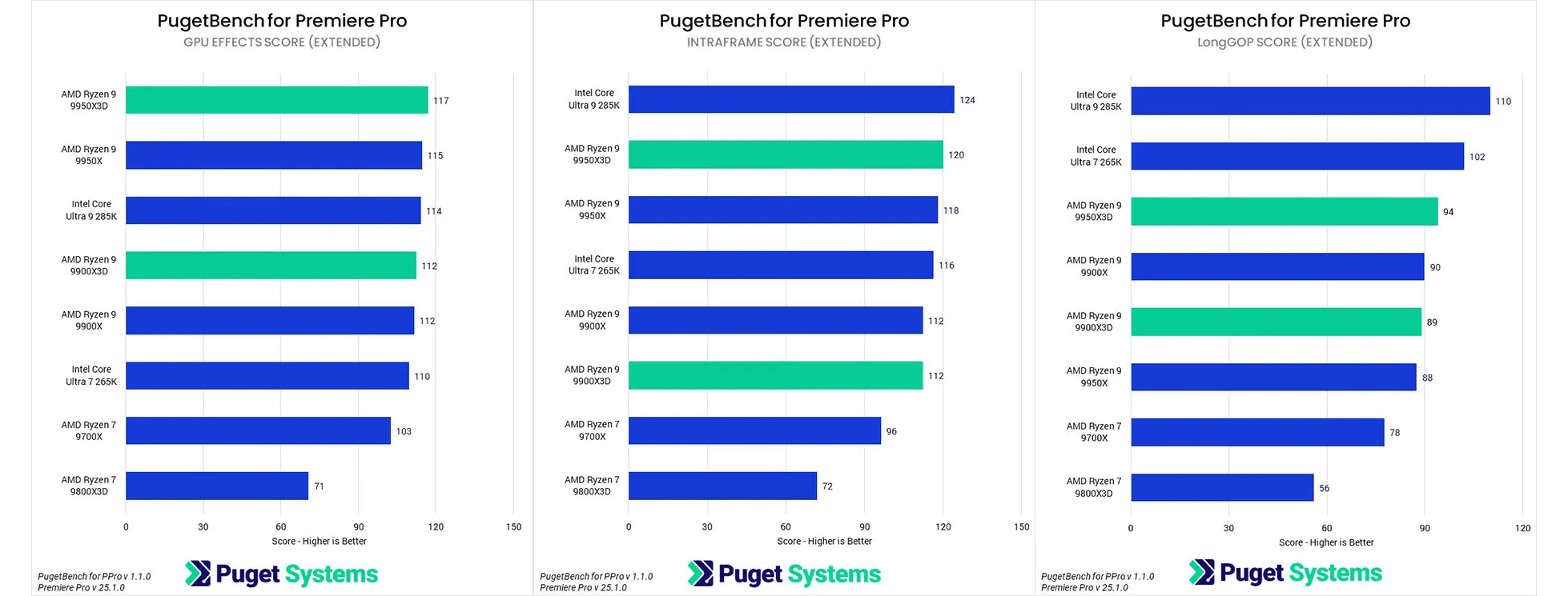 Trong môi trường Premiere Pro, bộ xử lý 9950X3D cho thấy hiệu suất ấn tượng, chỉ xếp sau 285K với khoảng cách 7% và vượt trội hơn 9950X 5%. Tuy nhiên, 9900X3D không đạt được những lợi ích tương tự, mà chỉ tương đương với 9900X. Điều quan trọng cần lưu ý là điểm số tổng thể không phản ánh đầy đủ hiệu suất của các bộ xử lý này trong Premiere Pro, đặc biệt là khi xem xét sự ra mắt gần đây của GPU NVIDIA dòng 50 và những cải tiến đáng kể về engine media của chúng.