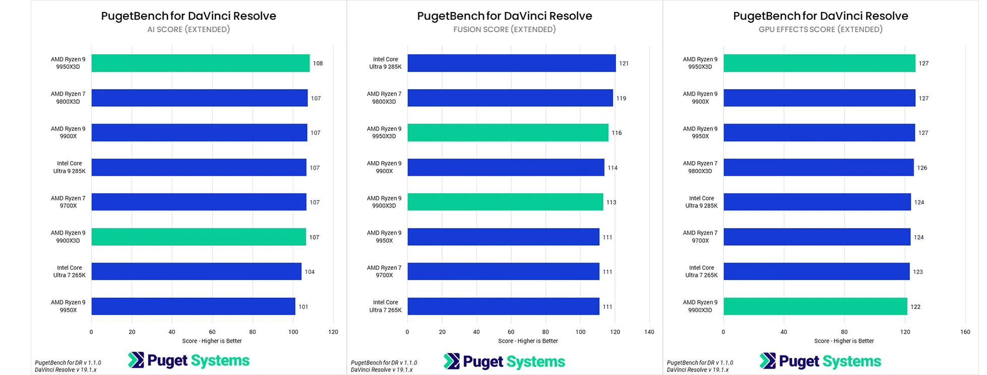 Các bài kiểm tra GPU Effects và AI chủ yếu phụ thuộc vào GPU, do đó, sự khác biệt giữa các CPU là không đáng kể. Tuy nhiên, trong Fusion, 285K vẫn dẫn đầu, tiếp theo là 9800X3D, nhưng chỉ nhanh hơn 9950X3D 4%, so với 9% so với 9950X. Mặc dù không có sự cải thiện đáng kể, nhưng việc AMD khắc phục được các vấn đề hiệu suất với 7950X3D là một tín hiệu tích cực.