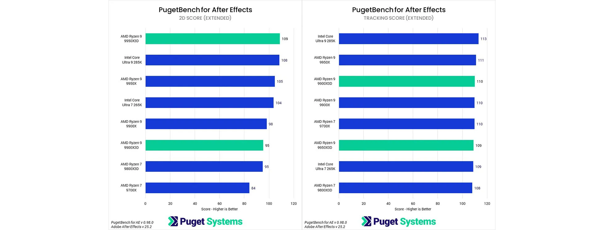 Khi chuyển sang Adobe After Effects, một ứng dụng khác chủ yếu phụ thuộc vào CPU, chúng tôi đã thực hiện một số thay đổi đáng kể đối với điểm chuẩn của mình, bao gồm việc bổ sung các quy trình làm việc 3D mới. Mặc dù các quy trình làm việc 3D phụ thuộc vào GPU, nhưng chúng tôi nhận thấy một số kết quả thấp hơn dự kiến trong điểm số tổng thể do phiên bản beta của After Effects được sử dụng. Do đó, chúng tôi chỉ tập trung vào các phần dựa trên CPU của điểm chuẩn: 2D và Tracking.