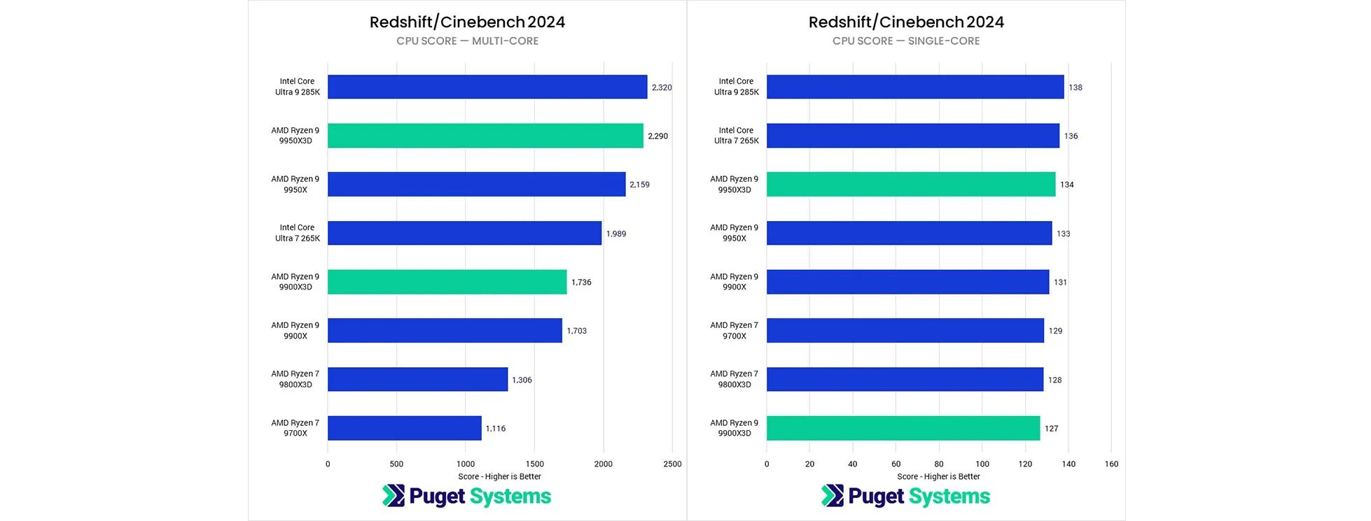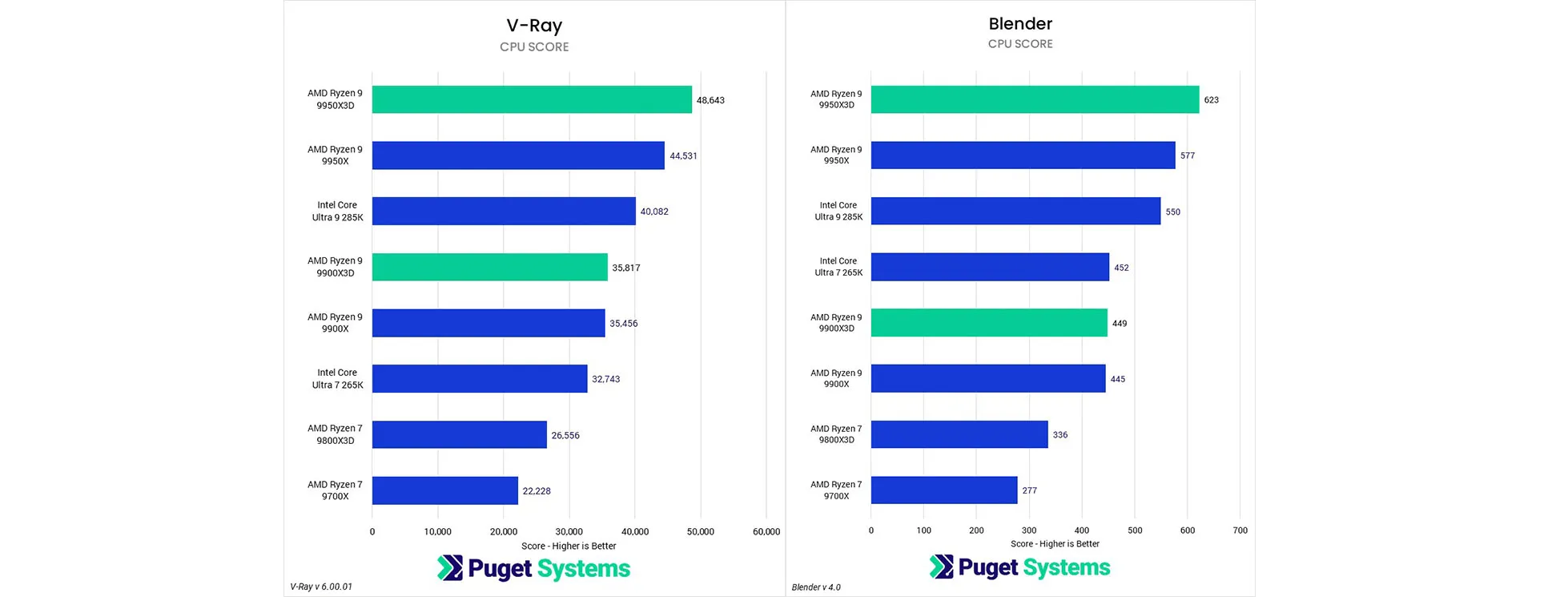 Blender, một công cụ kết xuất CPU phổ biến, thường cho thấy hiệu suất tốt trên các CPU AMD, đặc biệt là dòng Threadripper PRO 7995WX. Trong bài kiểm tra này, 9950X3D nhanh hơn 9950X 8% và nhanh hơn 285K 13%. 9900X3D có hiệu suất tương đương với 9900X và 265K. 9950X và 9950X3D là những lựa chọn tốt cho Blender, nhưng 265K có thể mang lại giá trị tốt hơn so với 9900X/9900X3D.