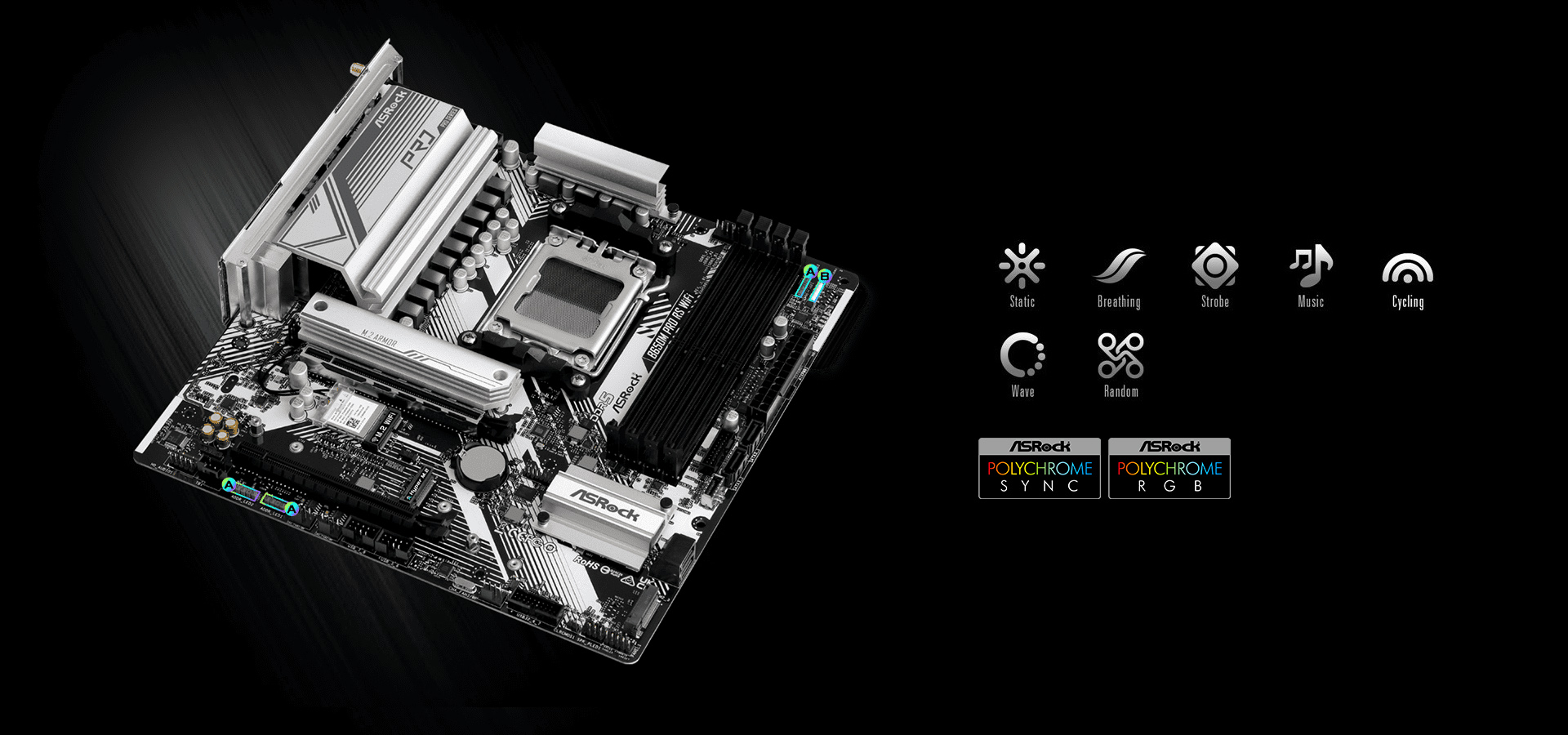 ASRock chỉ trang bị LED RGB ở khu vực phía trên gần cổng 24 pin. Tuy nhiên, ASRock đã trang bị thêm một đầu cắm RGB thông thường và ba đầu cắm RGB có thể định địa chỉ cho phép kết nối bo mạch chủ với các thiết bị LED tương thích như dải LED, quạt CPU, tản nhiệt… Người dùng cũng có thể đồng bộ hóa các thiết bị LED RGB trên các phụ kiện được chứng nhận Polychrome RGB Sync để tạo hiệu ứng ánh sáng độc đáo của riêng họ.