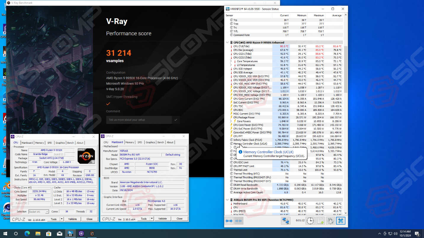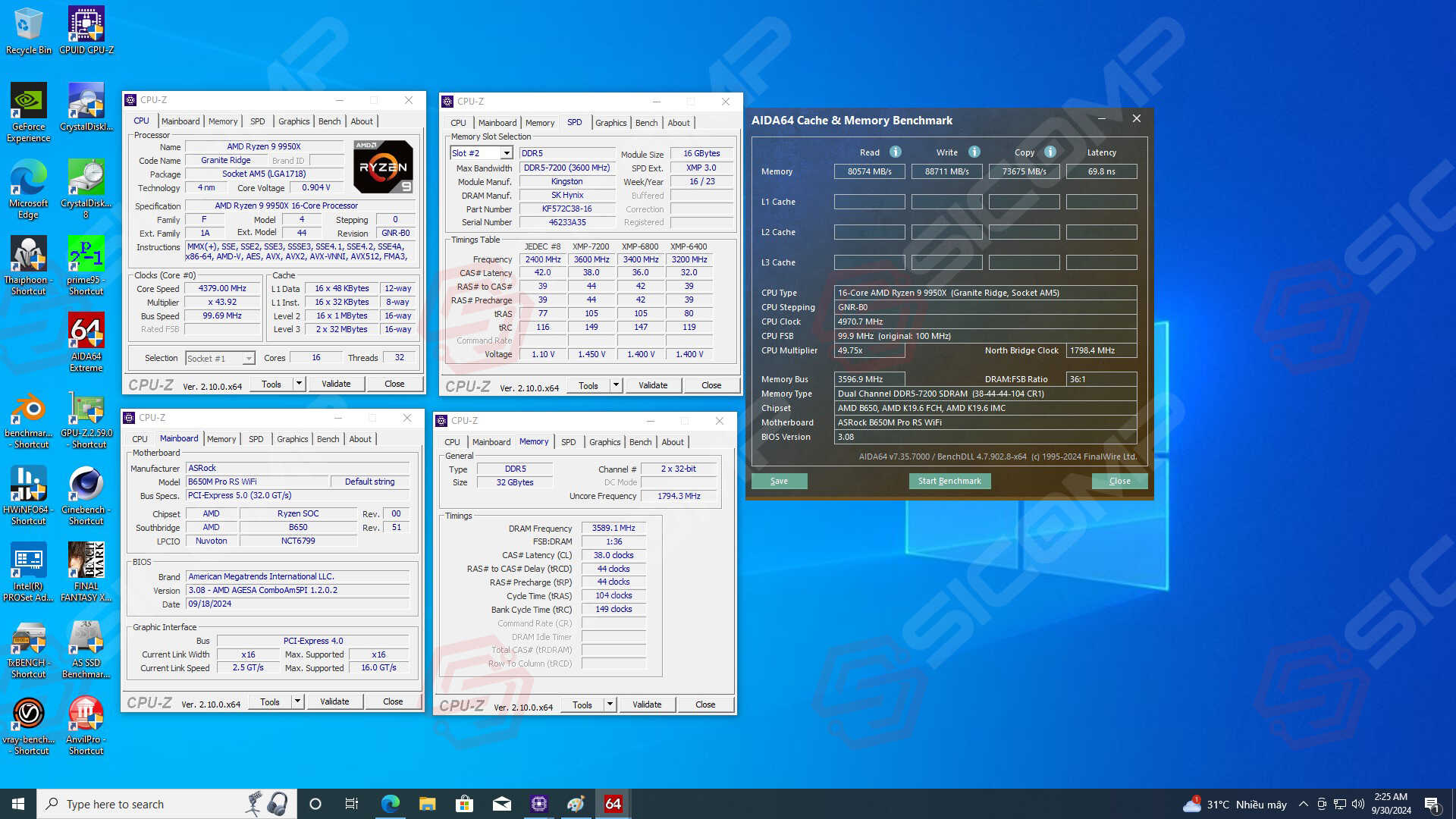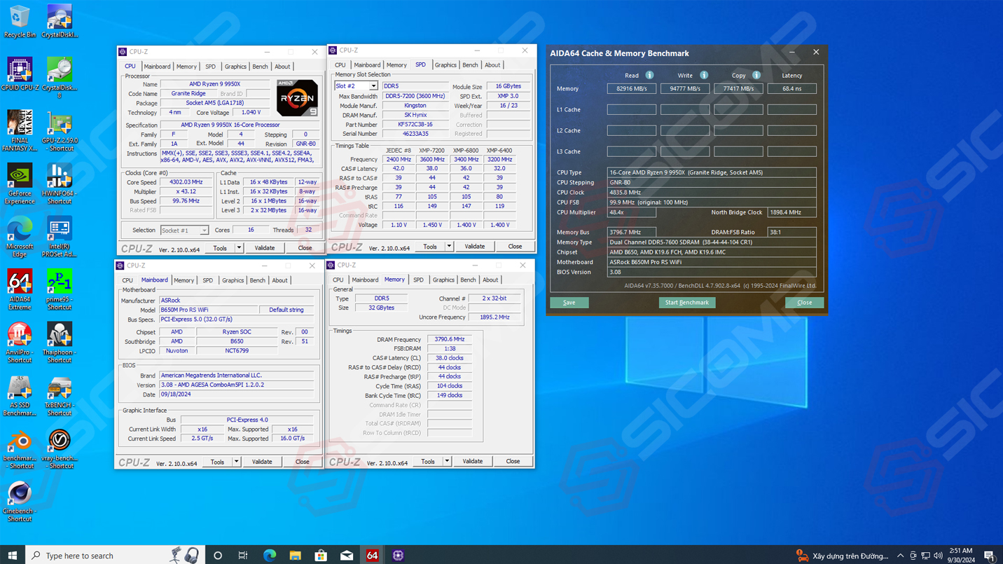 Theo thông số của ASRock thì B650M Pro RS WiFi có thể hỗ trợ mức xung RAM 7200MHz (OC), nên mình thử tiiến hành ép xung RAM lên mức 7600Mhz (không điều chỉnh timing). Kết quả là bo mạch chủ có thể khiển mức xung này nhẹ nhàng và vượt quá mức thông số mà nhà sản xuất đưa ra. Băng thông và độ trễ có cải thiện hơn so với khi XMP tuy nhiên không quá cách biệt nhiều do giá trị MCLK:UCLK:FCL bị điều chỉnh thành 1:2