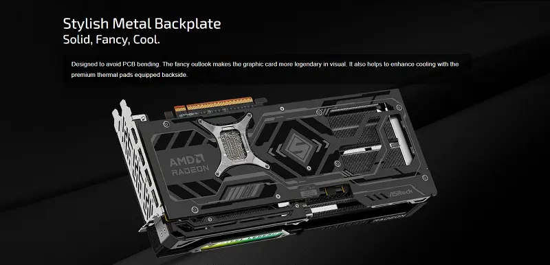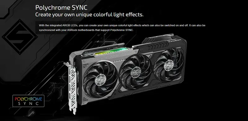 Toàn bộ card được bao phủ bởi lớp vỏ kim loại màu xám và đen mờ, điểm xuyết bằng các đường cắt phay tinh xảo. Hệ thống LED ARGB giờ đây có thể tự bật tắt và tạo hiệu ứng màu theo ý thích của cá nhân, VGA cũng đồng bộ với bo mạch chủ ASRock hỗ trợ Polychrome SYNC.