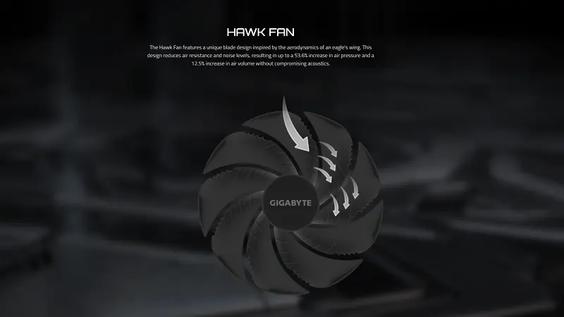 Vì tiêu thụ đến tận 600W, Gigabyte đã tạo ra hệ thống làm mát WINDFORCE thế hệ mới nhất với 3 quạt cánh gió hoạt động đảo chiều, luồng gió được phân bổ đồng đều, giảm thiểu nhiễu loạn không khí. Trục quạt sử dụng chất Graphene Nano giúp kéo dài tuổi thọ nhưng lại hoạt động êm hơn. Ngoài ra hệ thống quạt còn dừng hoàn toàn khi GPU đang được sử dụng ở mức thấp để kéo dài tuổi thọ vòng bi và giảm lượng bụi hút vào trong case.
