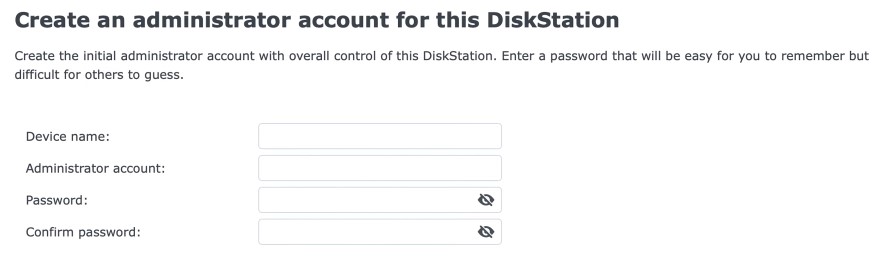 - Đặt tên máy chủ, tên người dùng và mật khẩu cho DiskStation của bạn.