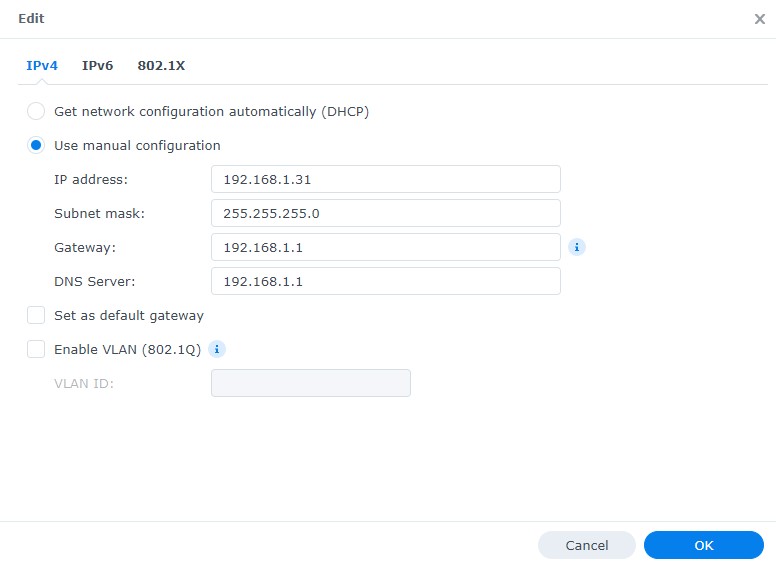 2. Chọn Use manual configuration và nhập Địa chỉ IP bạn muốn sử dụng. Subnet Mask, Port và máy chủ DNS đều có thể giữ nguyên như mặc định (vì chúng được lấy từ DHCP). Chọn OK. Cài đặt mạng của bạn sẽ được áp dụng và phiên DSM của bạn sẽ làm mới với địa chỉ IP mới của bạn.