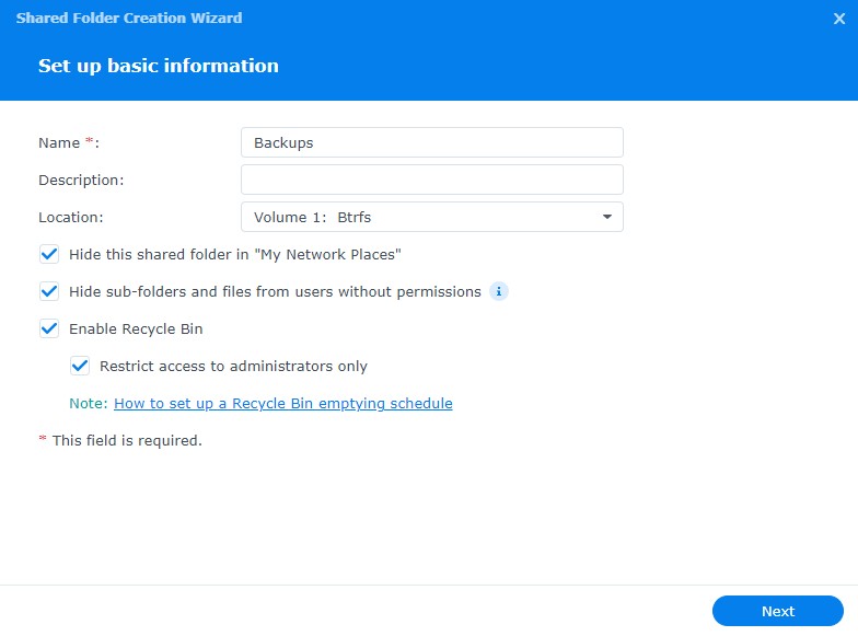 Ba tùy chọn tiếp theo là tùy chọn cá nhân dựa trên việc bạn có muốn các thư mục hiển thị với người khác hay không và nếu bạn muốn kích hoạt thùng rác (để các tệp không bị xóa vĩnh viễn).