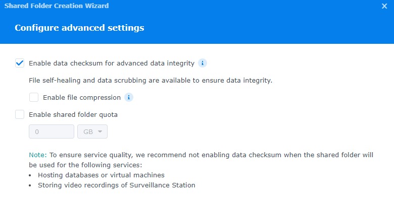 4. Bật data checksum(nếu có) và file compression/folder quota nếu bạn muốn. Chọn Next 2 lần liên tục.
