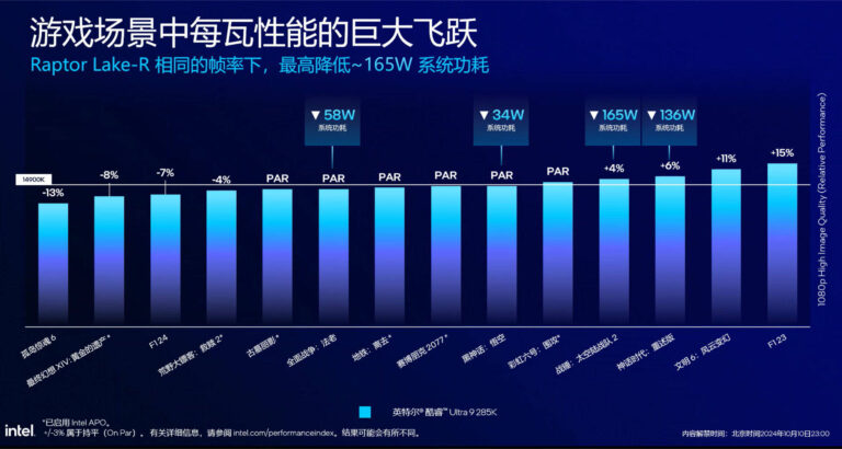 Một slide khác tiết lộ rằng hệ thống 285K có thể cung cấp hiệu suất tương đương với Raptor Lake-R (Refresh) trong nhiều trò chơi, trong khi tiêu tốn ít hơn gần 165W.