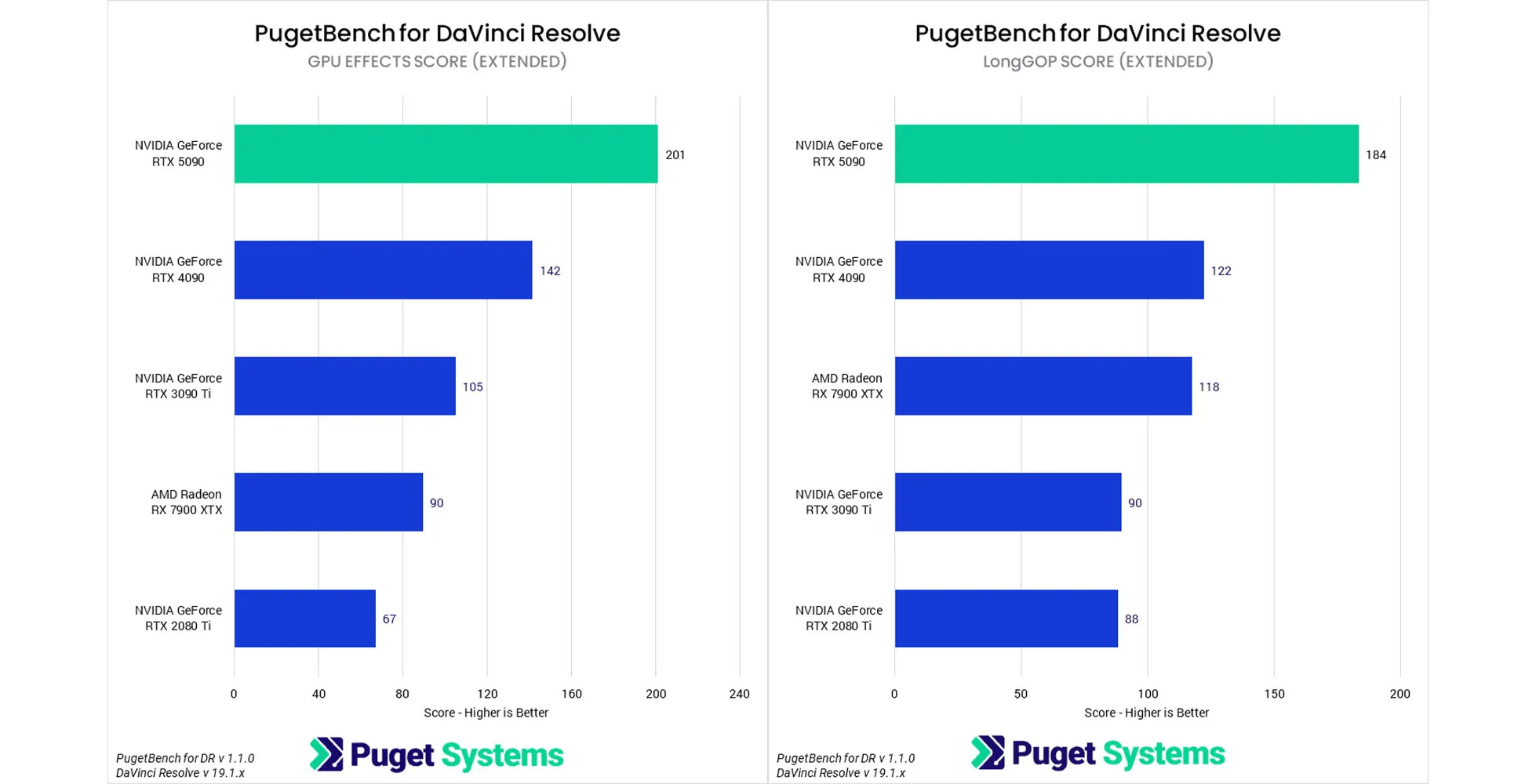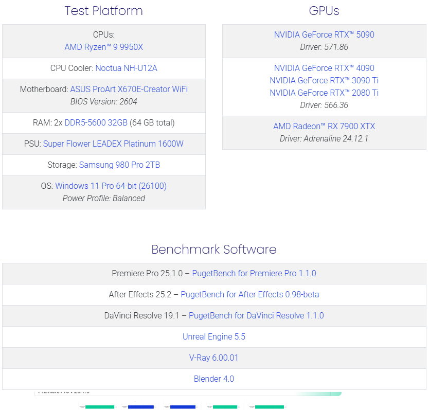 Hiện tại, RTX 5090 gặp một số vấn đề về tương thích phần mềm, nhưng chúng tôi tin rằng NVIDIA sẽ sớm khắc phục. Một số ứng dụng như Redshift (Cinebench) và Octanebench chưa hỗ trợ RTX 5090, trong khi Topaz Video AI và V-Ray cũng có vấn đề về hiệu suất. Trong bài viết này, chúng tôi sẽ tập trung vào kết quả kiểm tra từ PugetBench cho Premiere Pro, After Effects, DaVinci Resolve, cũng như Unreal Engine, V-Ray và Blender.