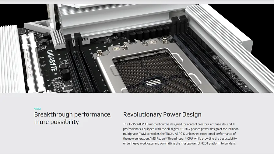Để chạy ổn định những con chip Threadripper ngốn tới 350W điện, Gigabyte TRX50 AERO D sở hữu dàn VRM kỹ thuật số 16+8+4 pha. Hệ thống tản nhiệt VRM được thiết kế với các lá tản nhiệt xếp lớp và ống dẫn nhiệt lớn, đảm bảo nhiệt độ luôn mát mẻ ngay cả khi hệ thống hoạt động 100% công suất trong thời gian dài. Một trong những điều quyết định tuổi thọ của Mainboard chuyên nghiệp.