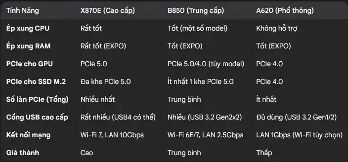II. So sánh các dòng chipset AMD phổ biến cho Socket AM5: X870E, B850, và A620