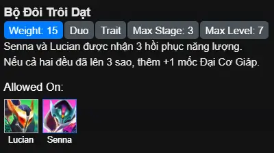 - Bộ Đôi Trôi Dạt: Senna và Lucian được nhận 3 hồi phục năng lượng. Nếu cả hai đều đã lên 3 sao, thêm +1 mốc Đại Cơ Giáp.
