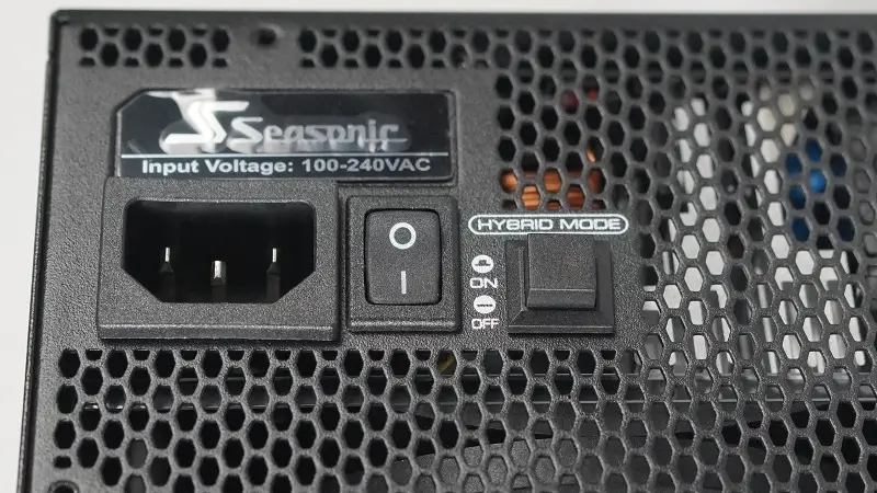 Phía sau của PSU được trang bị một công tắc vật lý cho phép người dùng bật/tắt chế độ Seasonic Hybrid Silent Fan Control. Khi được kích hoạt, quạt tản nhiệt sẽ không quay nếu mức tải của hệ thống dưới 30-40%. Điều này giúp PSU vận hành hoàn toàn im lặng trong các tác vụ văn phòng, lướt web hay xem phim. Khi tải tăng lên, quạt sẽ tự động quay và điều chỉnh tốc độ một cách thông minh dựa trên nhiệt độ và mức công suất tiêu thụ để đảm bảo làm mát hiệu quả.