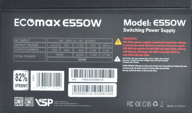 ECOMAXE550W là sản phẩm nguồn máy tính tới từ thương hiệu VSP. Được thiết kế cho các cấu hình máy vi tính phân khúc phổ thông với chi phí mua sắm hạn chế. Các tính năng chính của ECOMAXE550W có thể kể đến như: Công suất thực 550W, trang bị hệ thống cáp dạng bẹ đen mềm và sử dụng toàn bộ tụ điện thương hiệu Nhật Bản. Phía VSP cam kết hiệu suất hoạt động tối đa đạt 82% .