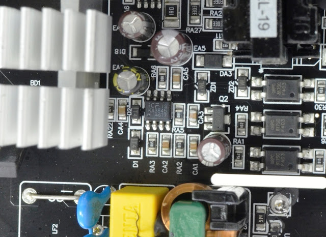 Do không trang bị tính năng Active PFC với điện áp ngõ ra lên tới 390VDC. Nên mạch PWM chỉ hoạt động ở mức điện áp khoảng 320VDC, phụ thuộc vào dao động điện lưới đầu vào. Vì thế khối linh kiện công suất được chọn với trị số cao hơn để đảm bảo hoạt động ổn định. Điều này cho thấy việc chọn lựa giữa linh kiện tối ứu thiết kế mạch. không phải lúc nào lắp linh kiện trị số "to" hơn cũng sẽ khỏe hơn mà phải xem từng thiết kế cụ thể ECOMAXE550W sử dụng 1 cặp mosfet Reasunos RS20N50F(20A), Dưới sự điều khiển của IC dao động KA3845