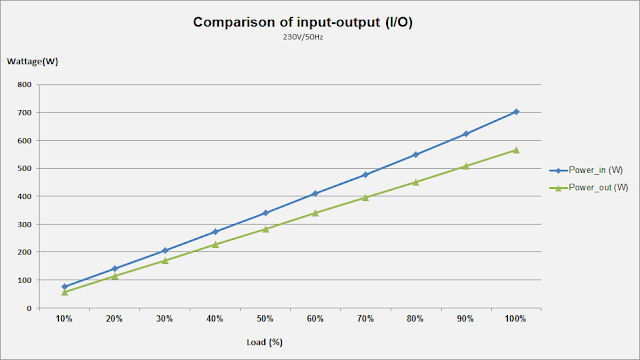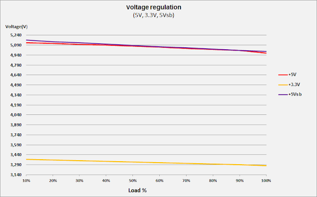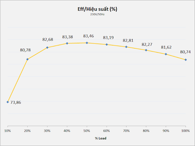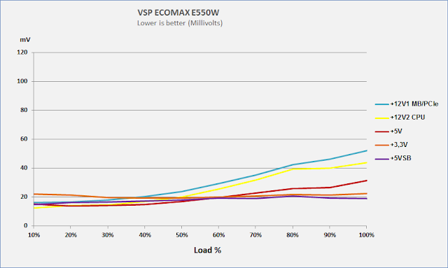 ECOMAXE550Whoàn thành các mức tải với điện áp dao động trong chuẩn ATX yêu cầu. Và do không trang bị tính năng DC to DC vì thế ở 2 mức tải không đồng đều(CL),Điện áp nhanh chóng "văng" ra khỏi tiêu chuẩn ATX. Cung như không được trang bị tính năng Active PFC khiến hệ số PF chỉ dao động trong khoảng 0.5, Hiệu suất tối đa đạt 83,46%@230Vac đúng như những gì VSP cam kết