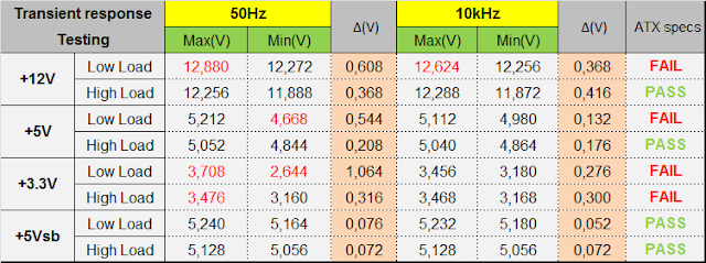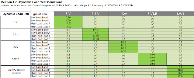 III-Thử nghiệm: 1-Load testing ( Thử tải): Nhằm đơn giản hóa bảng số liệu điện áp theo Test plan ATX3.0 từ Intel. Đường 12V nay sẽ chỉ còn 2 đường điện trong phép tử tải đối với nguồn Single rail 12V1: Mọi thứ tiêu thụ đường 12V trừ CPU (MB,PCIe,...) 12V2: Chỉ mình CPU (ATX12V/ESP12V) Từ ngày 14/4/2023: đường -12V được đưa vào mục thử tải, và tăng thêm mức thử tại 5% Load