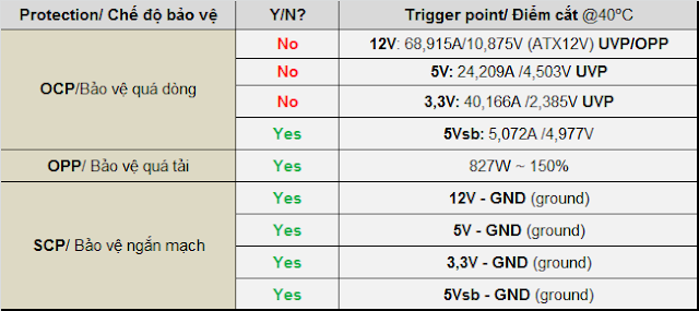 Do không được trang bị IC giám sát có hổ trợ tính năng bảo vệ OCP vì thế tính năng UVP sẽ được kích hoạt nhằm bảo vệ PSU, Chế độ OPP hoạt động tốt tuy nhiên điểm cắt dòng ~150% là hơi cao cho 1 PSU phân phổ thông giá rẻ